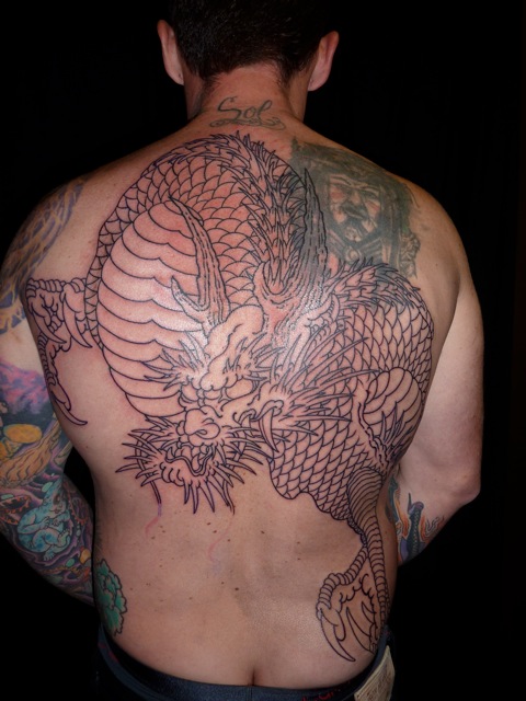 This one I'm pretty excited about and feeling good after the first session. He's been talking about covering up the old tattoo on his shoulder for a long time and when he finally made some appointments he said he just wanted to go with a huge dragon...perfect.